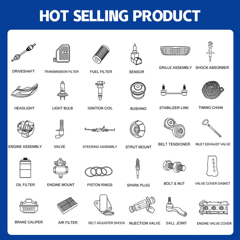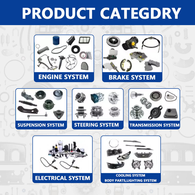 | 1. Sistemi motori | Testa di cilindro, pistone, canna di collegamento, albero motore, albero a camme, valvole, molle di valvola, guide di valvola, guarnizione della testa di cilindro, vasca dell'olio, pompa dell'olio, filtro dell'olio, filtro del carburante, iniettori di carburante, corpo dell'acceleratore,Manifold di aspirazione, collettore di scarico, turbocompressore (se applicabile), catena/cintura di sincronizzazione, volante, avvio, alternatore, supporti del motore, sensore di temperatura dell'acqua, sensore di pressione dell'olio, sensore di posizione dell'albero motore,misuratore di flusso d'aria, ecc. | |||